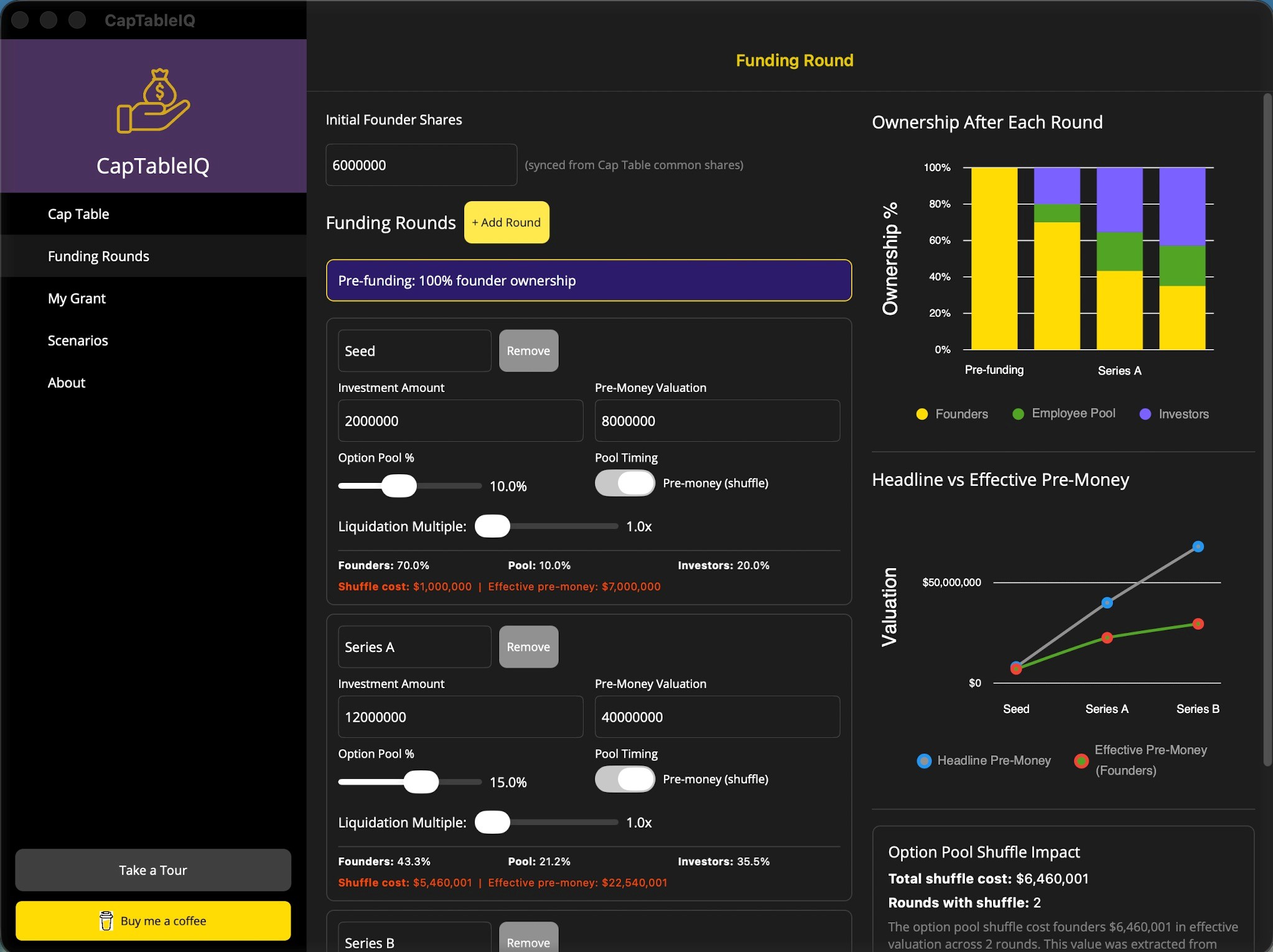 Visualize ownership erosion from Seed to Series C and beyond. Detect option pool shuffles and see the gap between headline valuations and what your shares are actually worth.