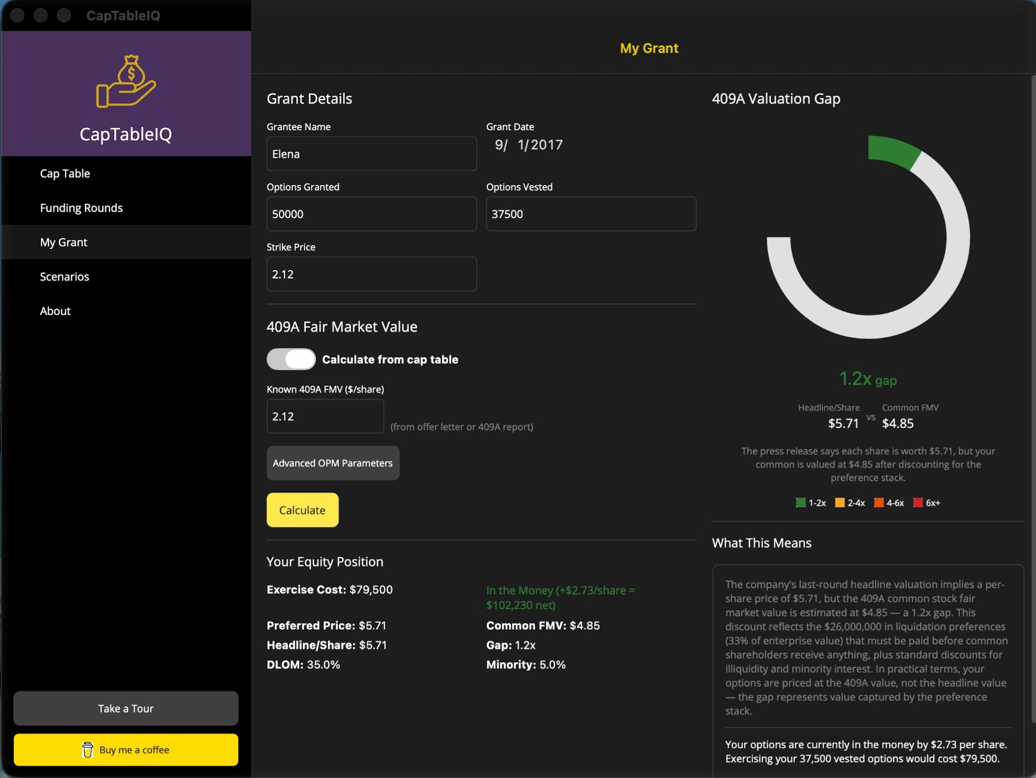 Built-in Option Pricing Model calculates common stock FMV using Black-Scholes methodology. Know if your options are in-the-money or underwater before you exercise.