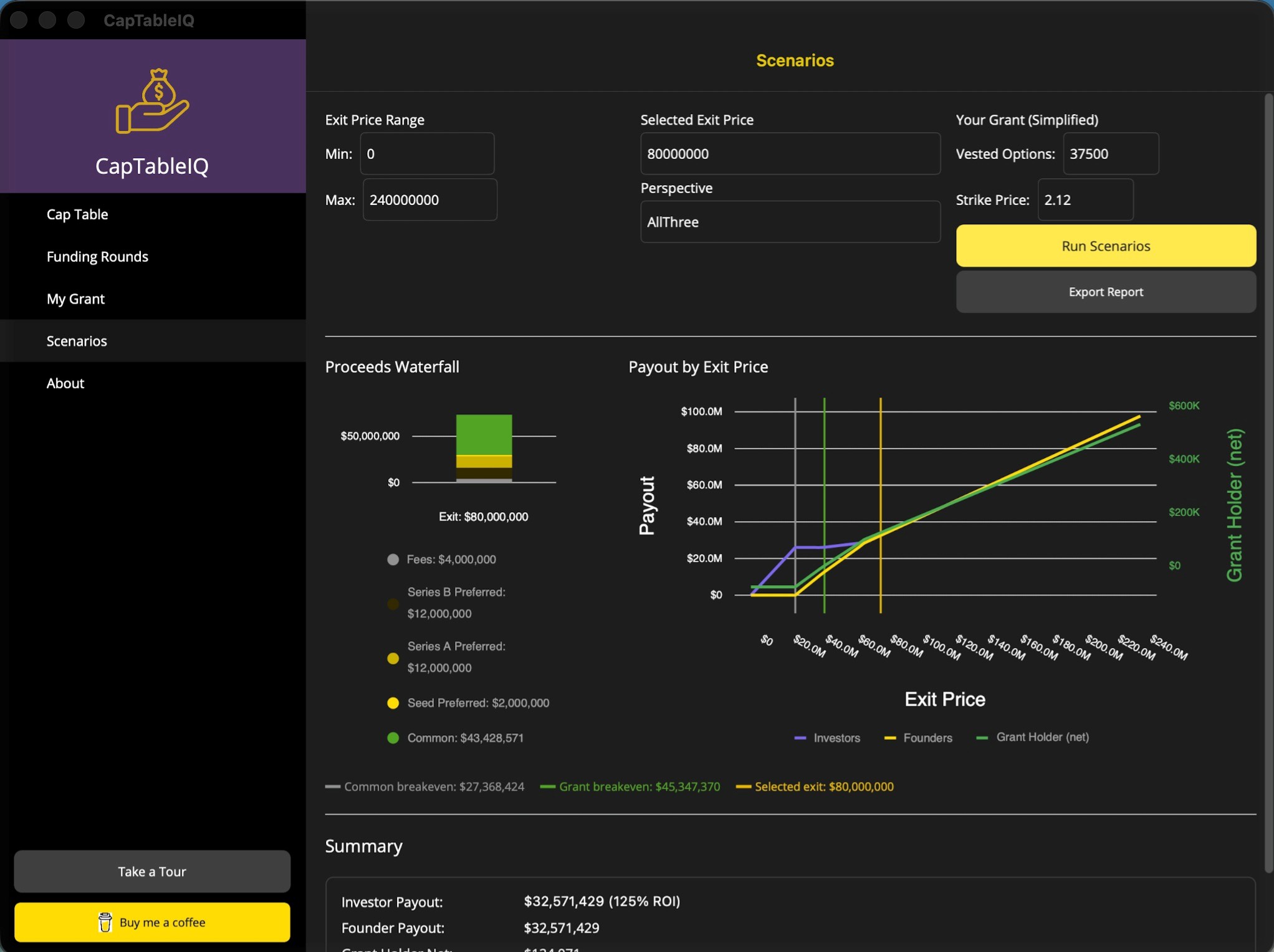 Generate 50-100 exit scenarios across any price range. Track investor returns, compare founder vs. employee payouts, and identify when option holders achieve 10x returns.